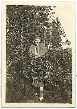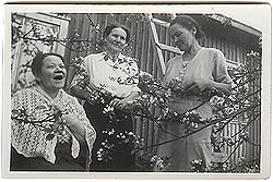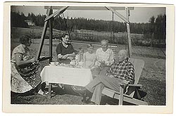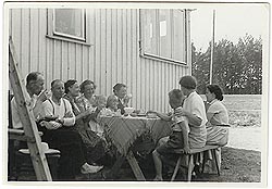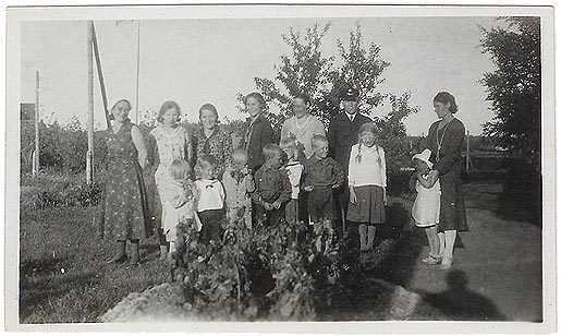 Tuomo, Yrjö, Fanny, Soile, Sirpa and Lempi Antturi. With their back to the camera are Pertti, Helmi and Kirsti. The photo is taken in front of Yrjö Elomaa's house